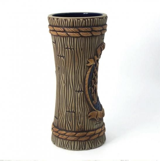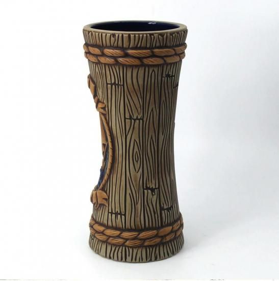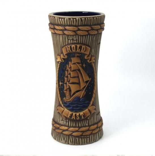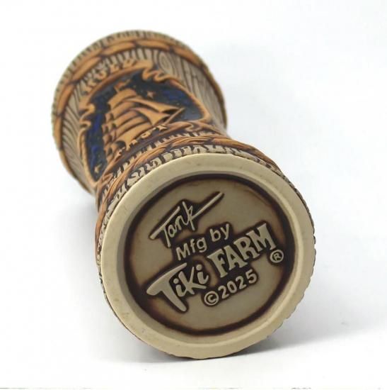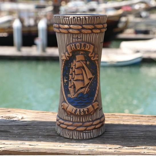 Designed for us by renowned Tiki Farm Art Director Tank Standing Buffalo, Homeward Bound features aged wooden staves, tonal rope lashing and features a rich moon & starlit rich lapis blue sky flanking a mysterious sea faring Clipper Ship. On the lower scroll, we are reminded of vessels present and past being at the mercy of the perilous seas and note such with the scroll emblazoned with HOLD FAST, a term popularized through the years into our modern era, tattoo-friendly culture as a statement of strength, fortitude and the power of the human will.