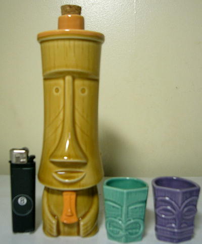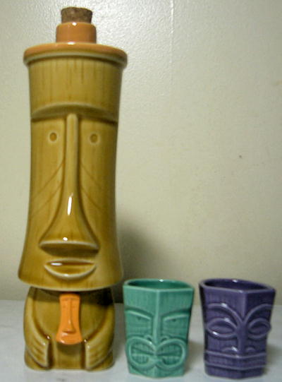 ミクロネシアのシンボル、茶系Tikiモチーフのデカンターに、別タイプTikiのショットマグ計3点セット!