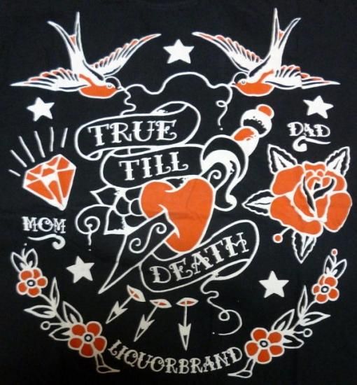 EU発のタトゥー系アパレル「Liquor Brand」のレディースTee 「MY FAMILY」です。Dagger Heartを中心に、Swallow, 薔薇等のラッキーICONが散りばめられた、タトゥーデザイン!