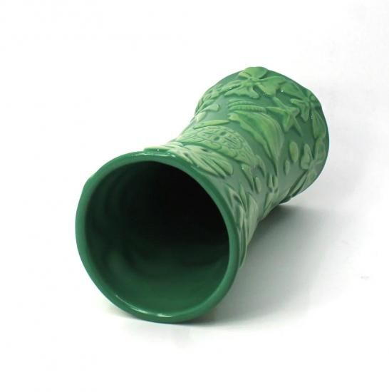 Glazed in a vibrant green glaze with the high points treated in tonal contrasts of dusty jade, this very special mug stands 7 ½" high and holds 18 oz.